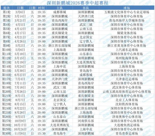 深圳新鵬城2026賽季中超賽程:首輪客戰(zhàn)蓉城,次輪主場(chǎng)對(duì)陣津門虎