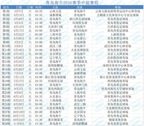 青島海牛2026賽季中超賽程:首輪客戰云南玉昆,次輪客戰成都蓉城