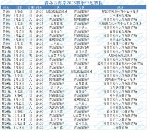 青島西海岸2026賽季中超賽程:首輪客戰浙江,次輪客戰海港
