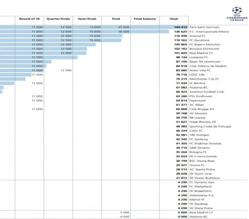 上賽季歐冠獎(jiǎng)金公布:巴黎超1.4億,國米阿森納巴薩等7隊(duì)破億
