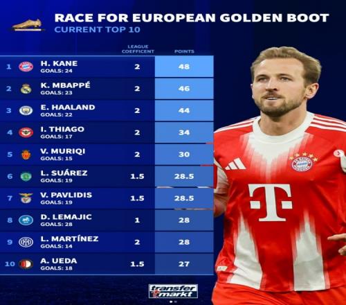 本賽季目前歐洲金靴獎積分榜:凱恩居首,姆巴佩次席、哈蘭德第三