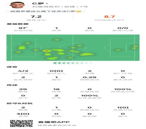 C羅本場比賽數據:1進球2解圍+傳球成功率100%,評分7.2