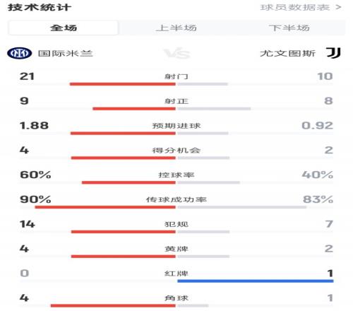 國米32尤文全場數據:射門2110,射正98,控球率60%40%