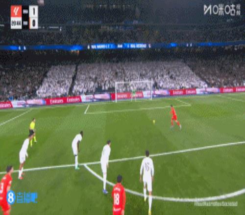 第90分鐘,皇馬前場右側定位球開到禁區,門前維尼修斯搶點,皮球砸在肩膀折射入網!但邊裁舉旗示意越位在先進球無效↓