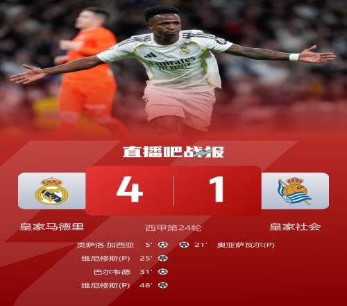 體育播報2月15日宣 西甲第24輪,皇家馬德里坐鎮主場伯納烏球場迎戰皇家社會。上半場,阿諾德妙傳助攻貢薩洛先拔頭籌,赫伊森送點,奧亞薩瓦爾點射扳平,維尼修斯造點+點射,巴爾韋德遠射破門。易邊再戰,維尼修斯再造點+點射。最終皇馬4-1皇社。積分榜方面,皇馬先賽60分登頂,皇社31分第八。