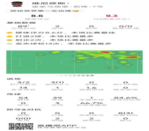 體育播報2月15日宣 在本輪西甲,皇馬4-1擊敗皇家社會,維尼修斯點射梅開二度,以下為他在本場數據: