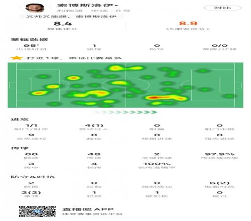 本場比賽索博斯洛伊為利物浦首發踢滿全場,在第56分鐘接薩拉赫助攻完成破門,本場比賽他的傳球成功率高達97.9%,攻防兩端都有建樹,最終他獲得8.4分的全場第二高評分,僅次于薩拉赫。