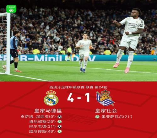 北京時間2月15日西班牙足球甲級聯賽 聯賽 第24輪,皇家馬德里主場對陣皇家社會。上半場,阿諾德助攻,貢薩洛-加西亞破門。赫伊森送點,奧亞薩瓦爾主罰命中。維尼修斯造點并親自罰入,卡雷拉斯助攻,巴爾韋德破門。下半場,維尼修斯再次造點并親自罰入。全場比賽結束,皇馬4-1擊敗皇家社會,取得西甲聯賽8連勝,并且在先賽一場的情況下暫時超越巴薩排名西甲榜首。