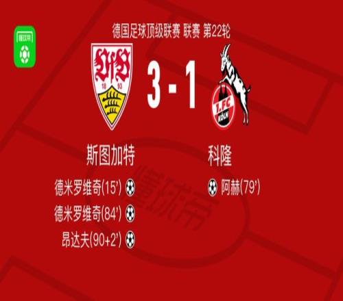 北京時間2月15日德國足球頂級聯(lián)賽 聯(lián)賽 第22輪,斯圖加特主場對陣科隆。斯圖加特德米羅維奇梅開二度,昂達夫破門。科隆阿赫破門。最終比分斯圖加特 3-1 科隆。