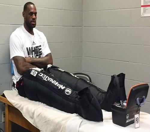 在湖人主場的一場比賽結束后,詹姆斯慢慢穿上冰浴足套,先把左腳、再把右腳浸入為他準備好的冰桶。他合作多年的私人訓練師兼運動表現教練邁克-曼西亞斯,隨后用冰袋裹住他的雙膝和背部。