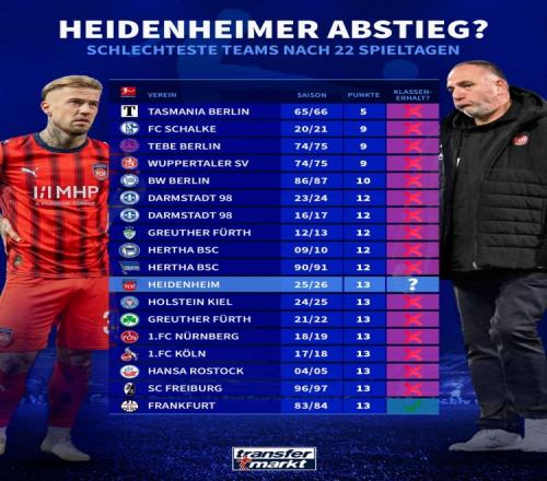 海登海姆22輪13分,德甲歷史同期未超過13分球隊僅法蘭克福保級