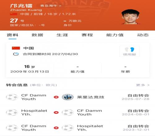 鄺兆鐳:2009年出生,司職前鋒,雖然年紀尚小,但鄺兆鐳在2023年便前往西班牙CF達姆青年隊進行歷練,先后效力奧斯皮塔萊特青年隊及萊里達競技。鄺兆鐳多次入選國少隊,為國出戰。鄺兆鐳是中國足壇極具潛力的年輕球員之一,期待他能夠快速融入球隊,適應中超節奏,在中超平臺取得充足的成長,給予球隊最大幫助,期待新賽季一起為青島而戰。