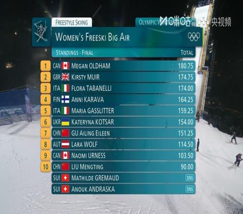 自由式滑雪女子大跳臺決賽第2輪:谷愛凌獲61.25分劉夢婷獲90分