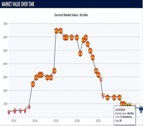 其中2015年6000萬買入的馬夏爾,堪稱是“古早版”失敗者。自摩納哥出道后他來到曼聯的,起初表現還算穩定,到2018年前后身價到過6500萬的高度的。可遺憾的是之后他再無太好的機會,2020年前后則遭遇到了崩盤,身價一落千丈的。到2022年只有3000萬不到。
