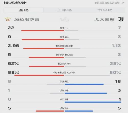 看看這組數據:全場射門22-7,射正9-3,控球率38%。加拉塔薩雷像在訓練賽一樣肆意穿插尤文的腹地。桑切斯、奧斯梅恩、諾阿·朗,甚至是被尤文舊將“羞辱”的薩拉,每個人都在尤文的禁區內跳舞。