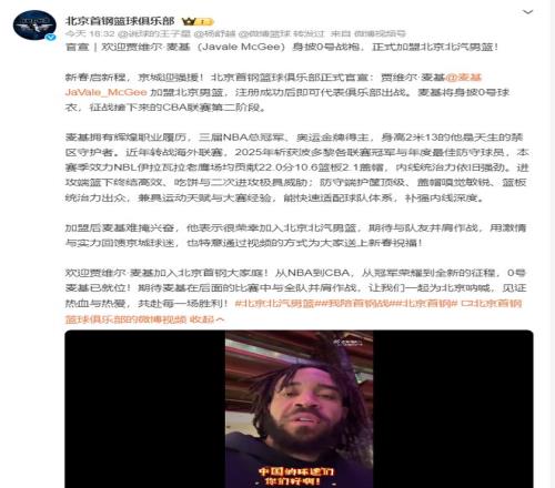 北京時間2月18日,北京首鋼男籃剛剛官宣麥基將身披0號球衣為北京男籃出戰,他將代表北京隊出戰CBA第二階段。從NBA到CBA,從三屆NBA總冠軍、奧運金牌到CBA全新的征程,麥基將與北京全隊一同并肩作戰。