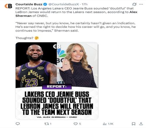 但兩小時(shí)后根據(jù),美記alex sherman的報(bào)道,湖人隊(duì)CEO珍妮-巴斯覺得勒布朗‘不太可能’會(huì)在下賽季重返湖人隊(duì)。雖然不能說(shuō)詹姆斯絕對(duì)不會(huì)重返LAL,但珍妮-巴斯透露詹姆斯從來(lái)沒(méi)有任何暗示將要重返湖人,詹姆斯對(duì)自己的職業(yè)生涯有絕對(duì)的控制權(quán)。