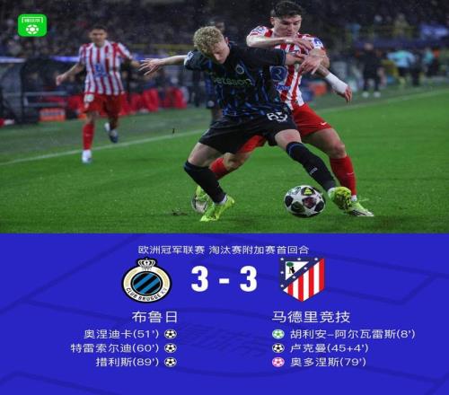 北京時間2月19日歐洲冠軍聯賽 淘汰賽附加賽首回合,布魯日對陣馬德里競技。布魯日奧涅迪卡破門,特雷索爾迪破門,措利斯破門,奧多涅斯自擺烏龍。馬德里競技胡利安-阿爾瓦雷斯破門,盧克曼破門。最終比分布魯日 3-3 馬競。