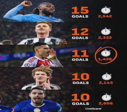 (對狼隊之前)數(shù)據(jù)統(tǒng)計,本賽季各項賽事打進(jìn)10球以上的英超邊鋒中,馬丁內(nèi)利是用時最少、效率最高的。