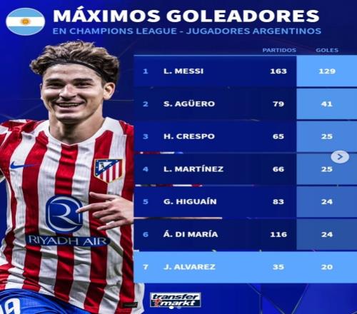 阿根廷球員歐冠進球榜:梅西129球居首,阿圭羅次席,小蜘蛛第7