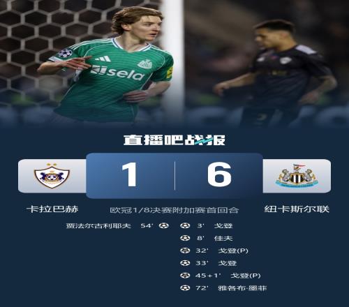 歐冠聯賽淘汰賽附加賽首回合,紐卡斯爾聯6-1大勝卡拉巴赫,戈登大四喜。