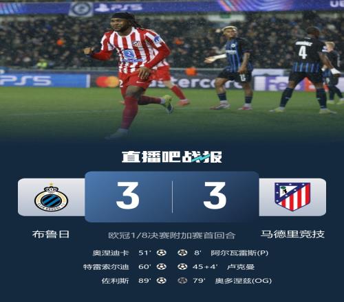 歐冠1/8決賽附加賽首回合,馬競3-3遭布魯日絕平,阿爾瓦雷斯、盧克曼進球。