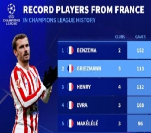 法國(guó)球員歐冠出場(chǎng)榜:本澤馬居首,格列茲曼、亨利、埃弗拉列前四