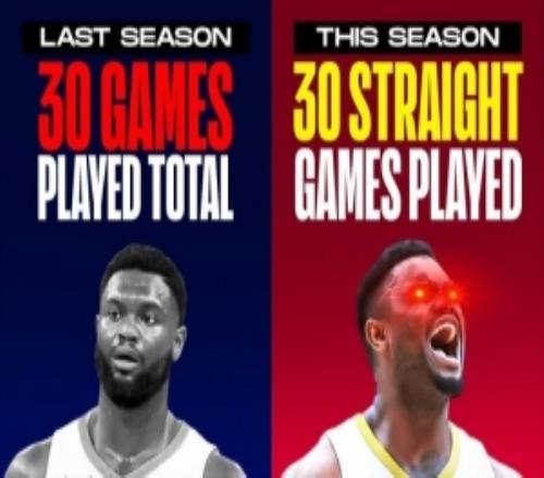 不再那么脆了!錫安已連續出場30場比賽上賽季一共才打30場