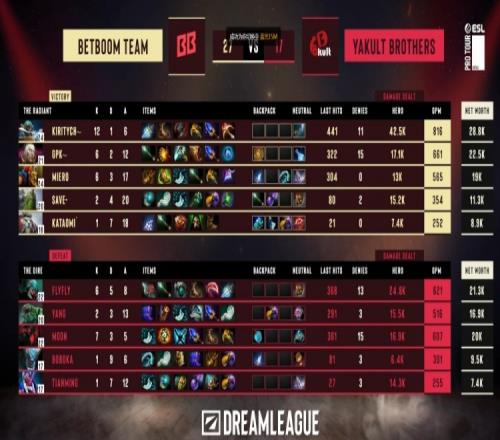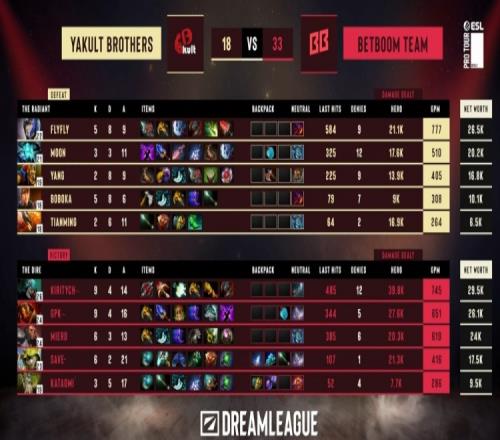 開場飛飛露娜搶符被BB三人逮捕一血,上路Kataomi大樹雙殺,save小松鼠游走中路幫助gpk擊殺MooN藍貓。BB開啟殺戮模式,MieRo斧王與Kiritych螞蟻經濟前二,下路團戰2換2,YB經濟劣勢穩定在3k。隨后BB下路推進殺掉飛飛后二塔沒破三人越高地塔開送。