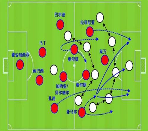 巴薩的這套高位逼搶踢法下,萊萬和拉菲尼亞是很重要的。拉菲尼亞的積極性和投入度是有目共睹的,萊萬的優(yōu)勢在于他的身高腿長和做動作的柔韌性。