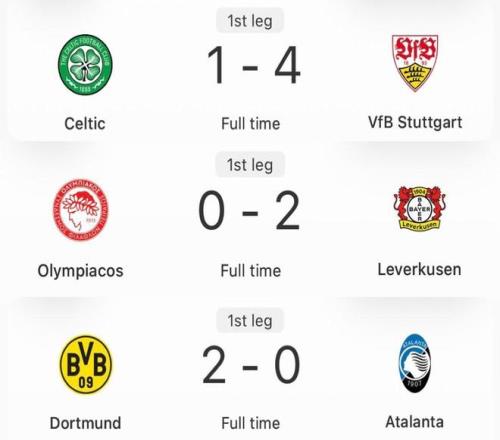 本周結束的歐戰淘汰賽附加賽首回合,多特蒙德歐冠主場2-0擊敗亞特蘭大,勒沃庫森歐冠客場2-0戰勝奧林匹亞科斯,斯圖加特歐聯杯客場4-1完勝凱爾特人,德甲三隊全部贏球,晉級形勢大好。