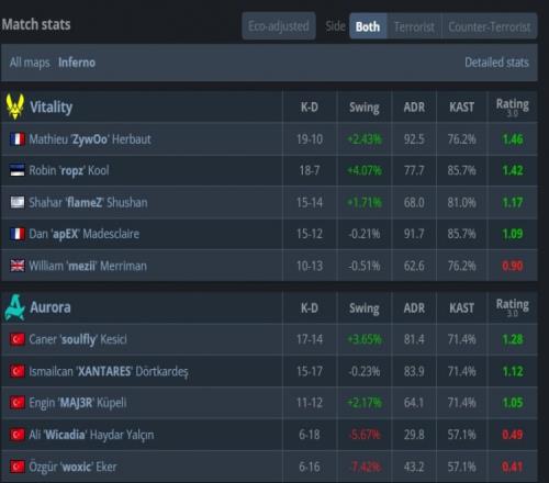易邊再戰,Aurora拿下手槍局,小蜜蜂次回合強起,Zywoo工地反清打掉soulfly后,ropz與火仔三殺收割戰場拿到第10分。