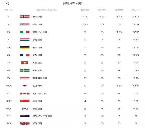 目前中國代表團排名獎牌榜第12位,挪威17枚金牌、37枚獎牌遙遙領先,第二名美國10金,第三名意大利9金。