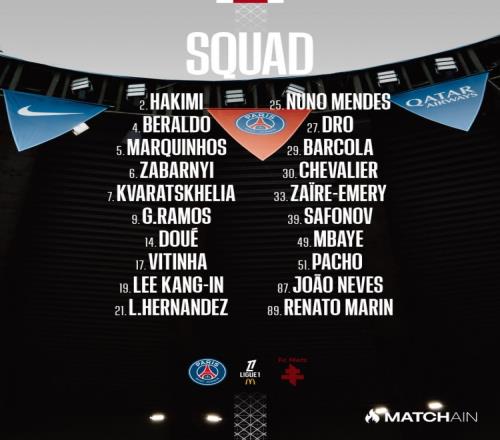 前鋒:7-克瓦拉茨赫利亞、9-貢薩洛·拉莫斯、14-杜埃、29-巴爾科拉、49-姆巴耶