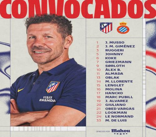 前鋒:7-格列茲曼、9-瑟爾洛特、11-阿爾馬達(dá)、19-阿爾瓦雷斯、20-朱利亞諾·西蒙尼、22-盧克曼