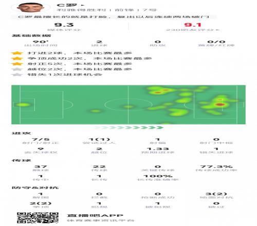 C羅本場數據:7射5正,2粒進球,1次錯失進球,評分9.3
