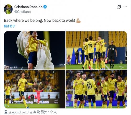 此役過后,利雅得勝利登頂沙特聯(lián)賽積分榜,C羅社媒曬出比賽照片,配文:“回到了我們該在的位置,現(xiàn)在回去繼續(xù)努力!”