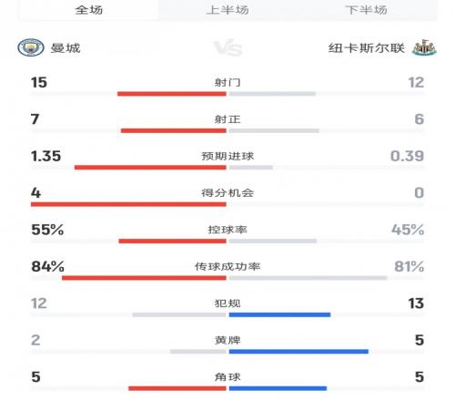 曼城vs紐卡數(shù)據(jù):射門15比12、進(jìn)球機(jī)會4比0、控球率55%比45%