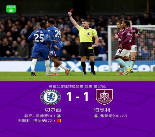 北京時間2月21日23:00,英超第27輪展開爭奪,切爾西坐鎮斯坦福橋球場迎戰伯恩利,本場主裁判為劉易斯-史密斯。上半場,內托助攻若昂-佩德羅閃擊,帕爾默失良機。下半場,韋斯利-福法納踩人犯規吃到第二張黃牌被罰下,弗萊明補時階段頭槌絕平。最終,十人切爾西1-1伯恩利。