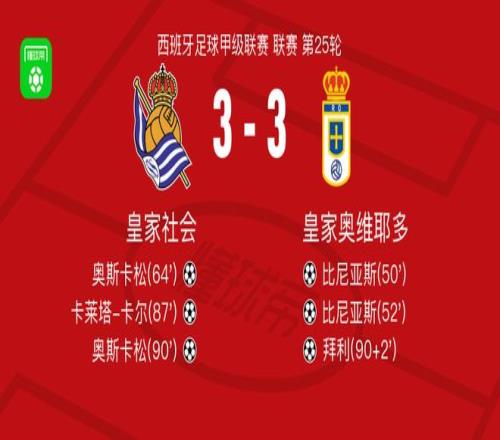 北京時(shí)間2月21日西班牙足球甲級聯(lián)賽 聯(lián)賽 第25輪,皇家社會(huì)主場對陣皇家奧維耶多。皇家社會(huì)奧斯卡松梅開二度,卡萊塔-卡爾破門。皇家奧維耶多比尼亞斯梅開二度,拜利破門。最終比分皇家社會(huì) 3-3 皇家奧維耶多。