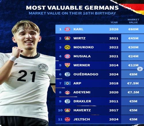 德轉(zhuǎn)列歷史18歲生日時德國球員身價榜:歐元
