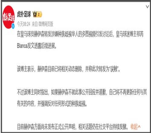 輿論升級過程中,有一位網紅博主嘗試聯系皇馬俱樂部和赫伊森本人,都沒有得到正式回應,繞了一圈聯系了赫伊森的隊友,也就是皇馬俱樂部其他球員,才被告知是赫伊森不小心碰到了才轉發的,包括刪除動態,都是赫伊森隊友和赫伊森媽媽提醒的——他媽媽來了!他媽媽真的來了!