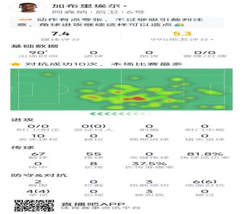 加布里埃爾本場數據:10次對抗全部成功,3次搶斷,2次攔截