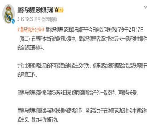 當(dāng)皇馬剛為維尼修斯遭遇種族歧視,迅速官方回應(yīng)強(qiáng)硬維權(quán),高喊反歧視的口號。