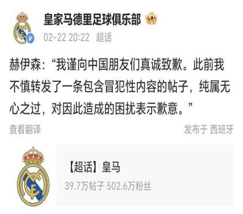 2月22日,皇馬官方微博超話發(fā)布一則消息,疑似為赫伊森進(jìn)行道歉。但是,皇馬官網(wǎng)和赫伊森個(gè)人社媒并無相關(guān)內(nèi)容。