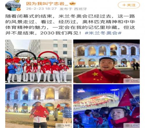寧忠巖社媒:米蘭冬奧會會在自己的記憶里珍藏,2030我們再見!