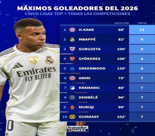 北京時間2月24日,德轉(zhuǎn)統(tǒng)計出了2026年至今歐洲五大聯(lián)賽球員各項賽事的進球榜,哈里-凱恩以13球排名第一,姆巴佩9球位列第二,哲凱賴什、格林伍德、登貝萊以及吉拉西上榜。