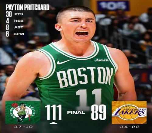 凱爾特人客場(chǎng)111-89血洗湖人!普里查德38分鐘轟30分8助,三分9中6,這效率比你搶到限量球鞋還上頭。對(duì)普里查德來說,這已是生涯第10次30+,其中5次在本賽季——上賽季最佳第六人,年薪才670萬,現(xiàn)在直接起飛!賽季初對(duì)騎士狂砍42分,這場(chǎng)對(duì)湖人又30分,三分6中6,罰球4中4,簡(jiǎn)直把湖人防得懷疑人生。