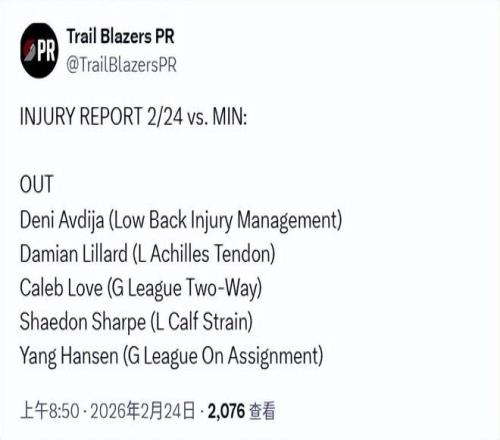北京時間2月24日,根據開拓者的最新傷病報告,楊瀚森明日將繼續出戰G聯賽,代表混音隊再戰圣克魯斯勇士。開拓者官方也連續宣布了兩項與楊瀚森相關的活動。
