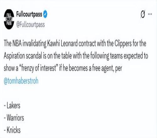 北京時間2月24日,據NBA記者湯姆-哈伯斯特羅報道,因此前涉及的陰陽合同問題,NBA有可能會宣布萊昂納德與快船的合同無效。一旦萊昂納德成為自由球員,預計湖人、勇士、尼克斯等球隊會瘋狂追求他。哈伯斯特羅在節目上的報道如下——